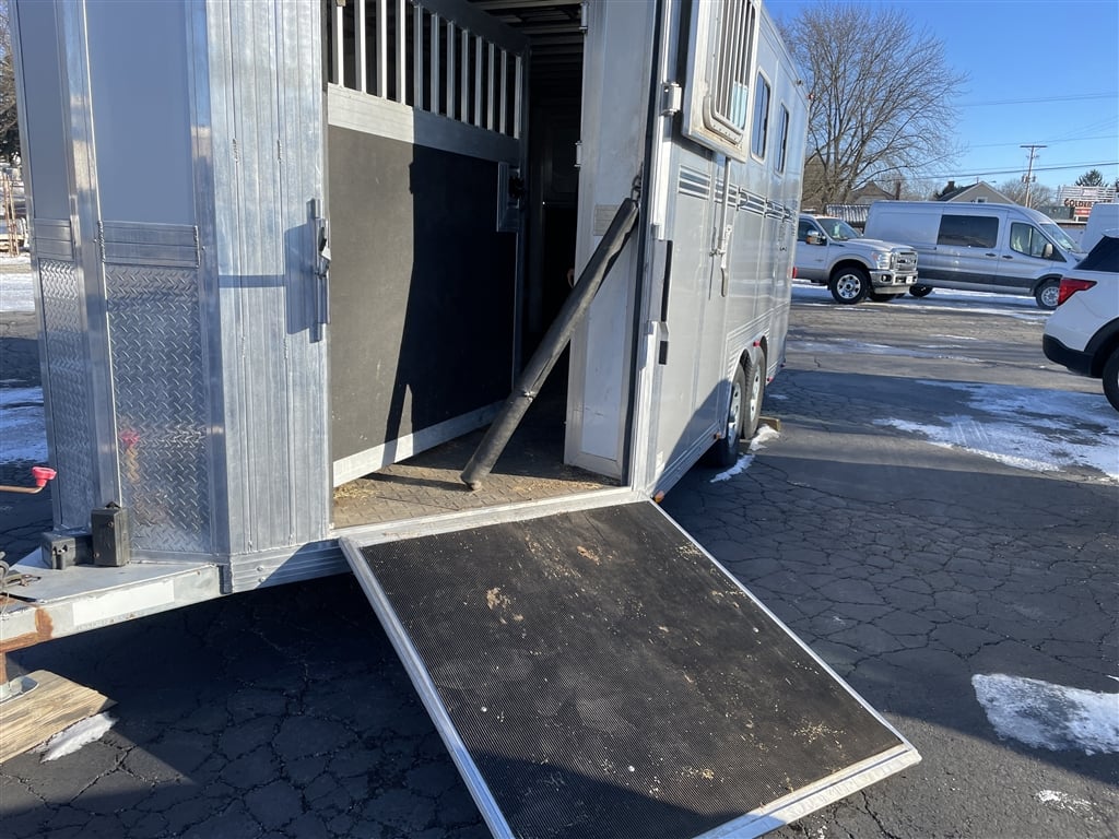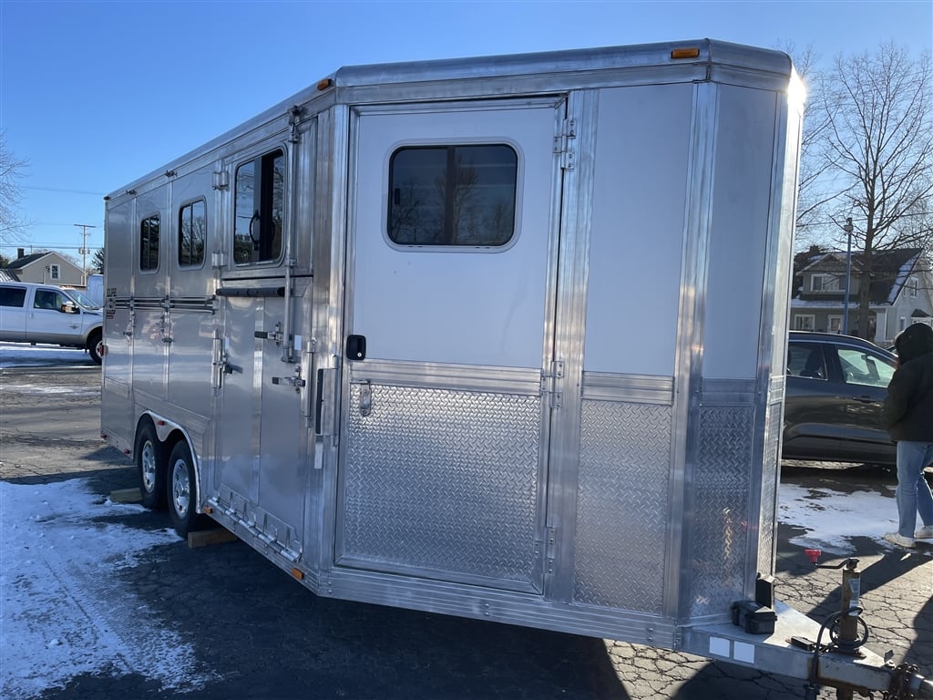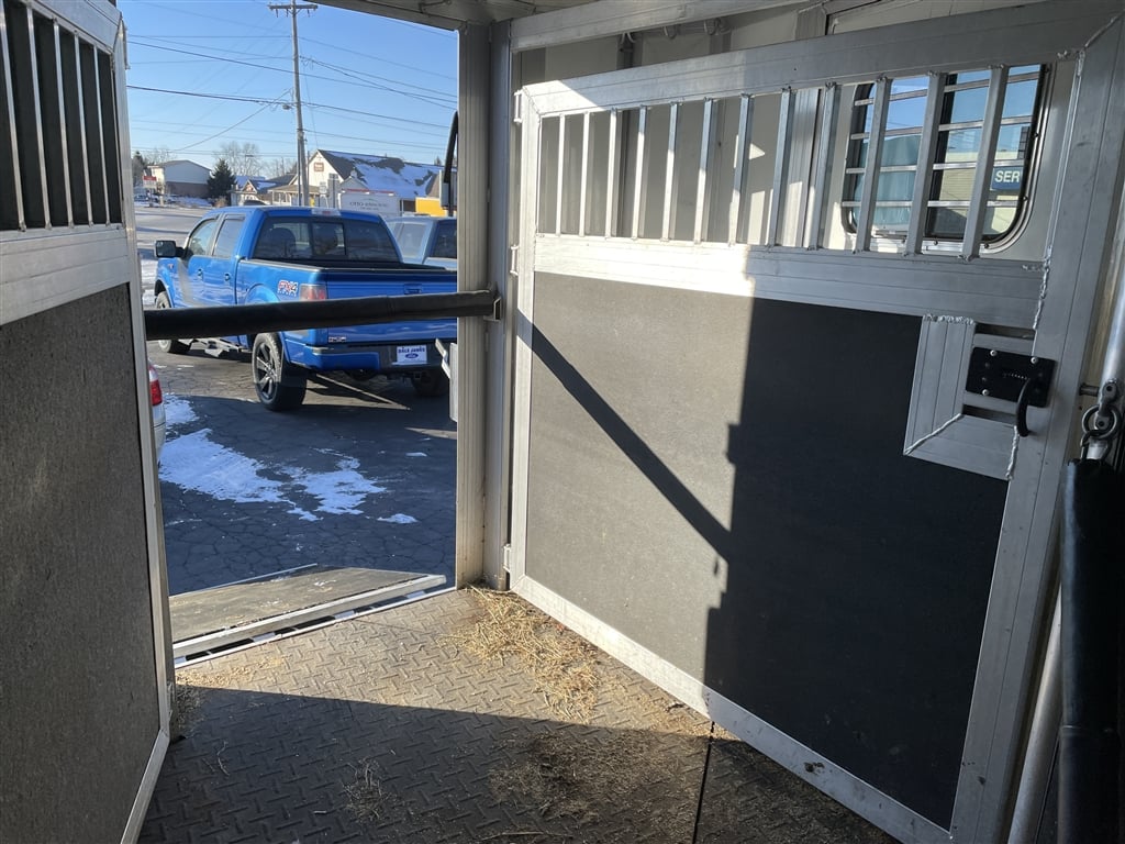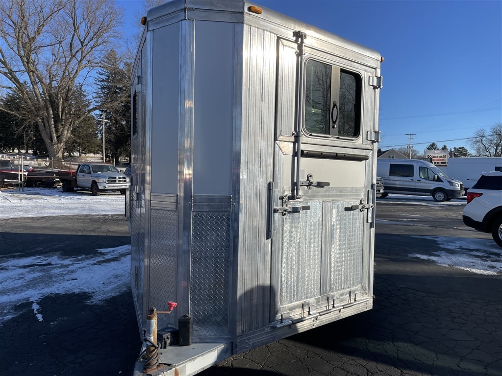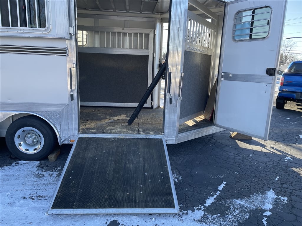 High quality, Custom Designed Horse Trailer. Front Tack area, with it's own Door. Moveable slant panels in front, with ramps on right and left sides, to load and walk your horse right through. Above the front and side ramps are tinted and barred windows that can slide open, or the whole top window panel can be opened up for more air flow. The large rear area has a full-width ramp with left and right top panels that can also be fully opened for more ventilation. All the ramps and floor of the trailer are equipped with non-skid rubber material. Every ramp and top opening panel can either be solidly latched in an open position for travel, or a closed position with provisions to lock everything down for security. Very solidly built with many moving panels for flexibility. Very gently used to occasionally move one horse and a carriage. Easy towing V-Nose design, Custom Chrome 15'' wheels, tires in good shape, 9950 GVW, bumper pull set up for 2 5/16'' ball. Originally designed as a horse trailer, but this would also easily serve as a toy hauler or contractors trailer. For play, You could use the back for quads or side by sides, and make the front into a camper. The builder could install work benches and tool storage down the sides, and have the center wide open to work or haul and securely store materialsat the jobsite. The perfect workshop on wheels. Lots of uses for lots of people. Please stop by an explore the possibilities for yourself. Thanks for looking.