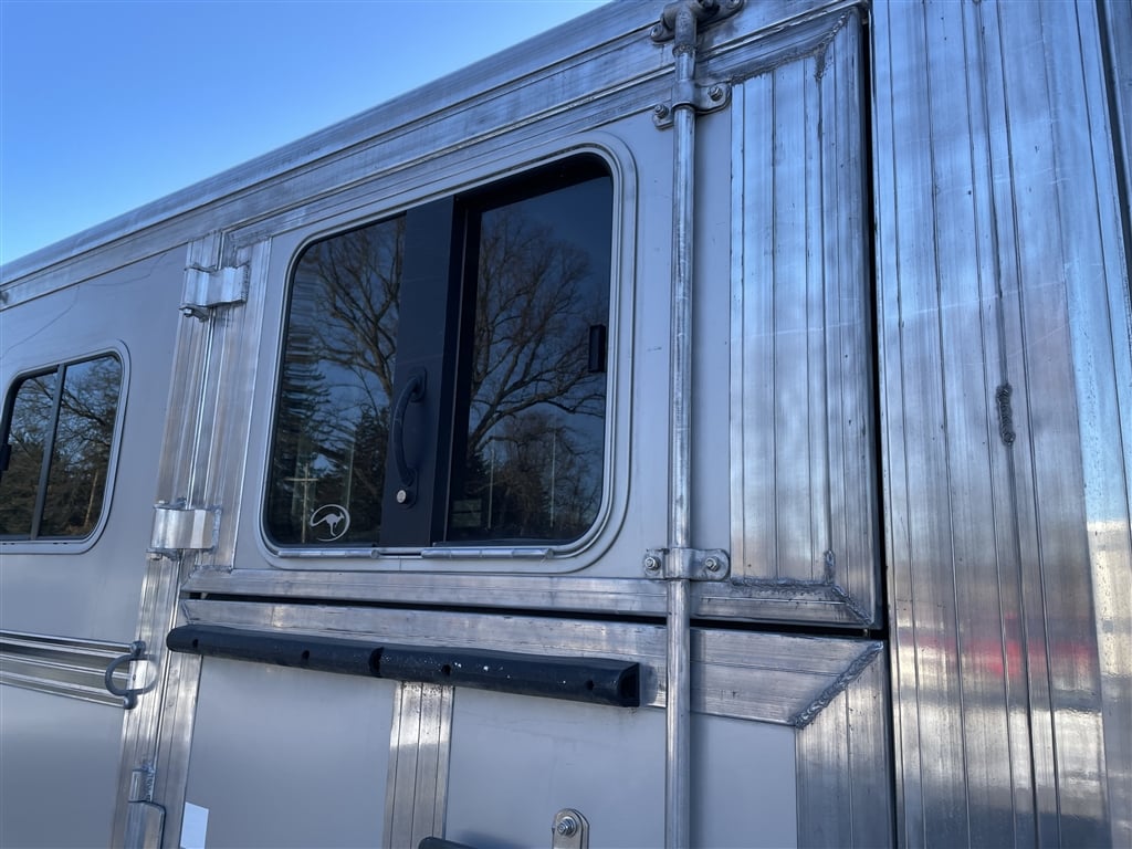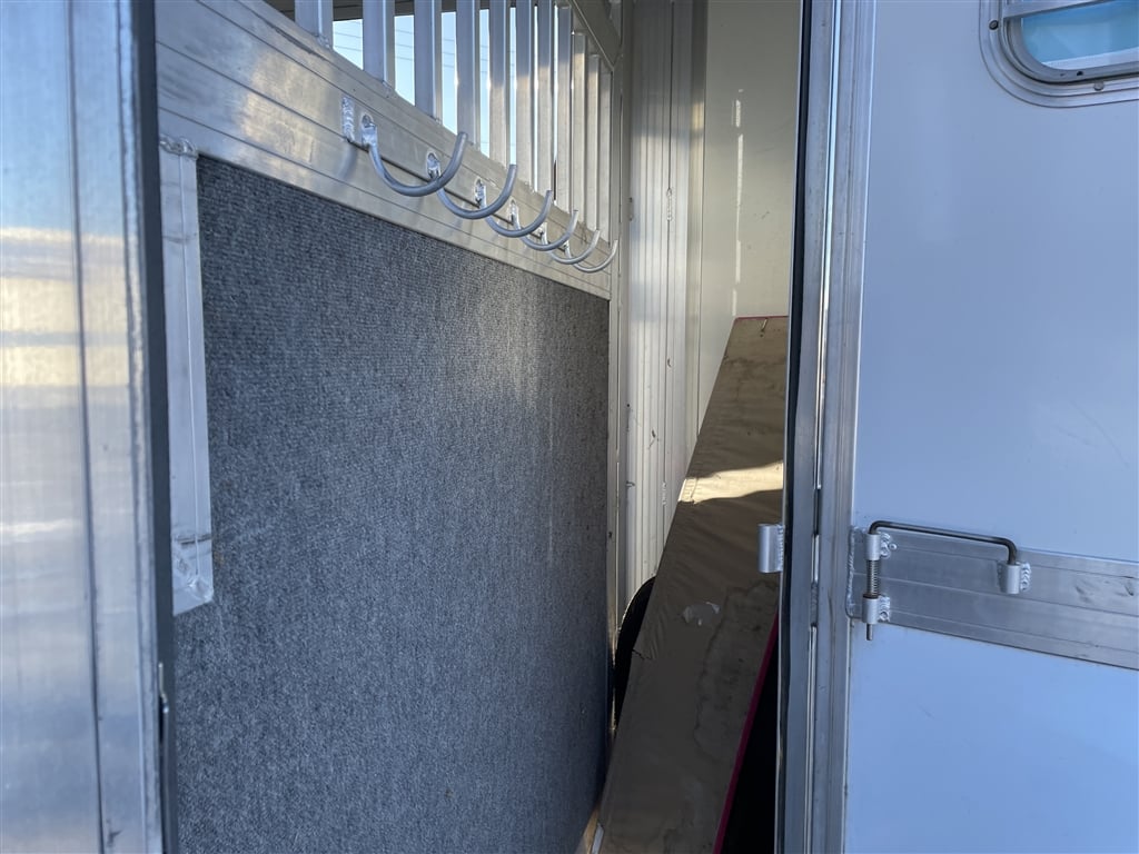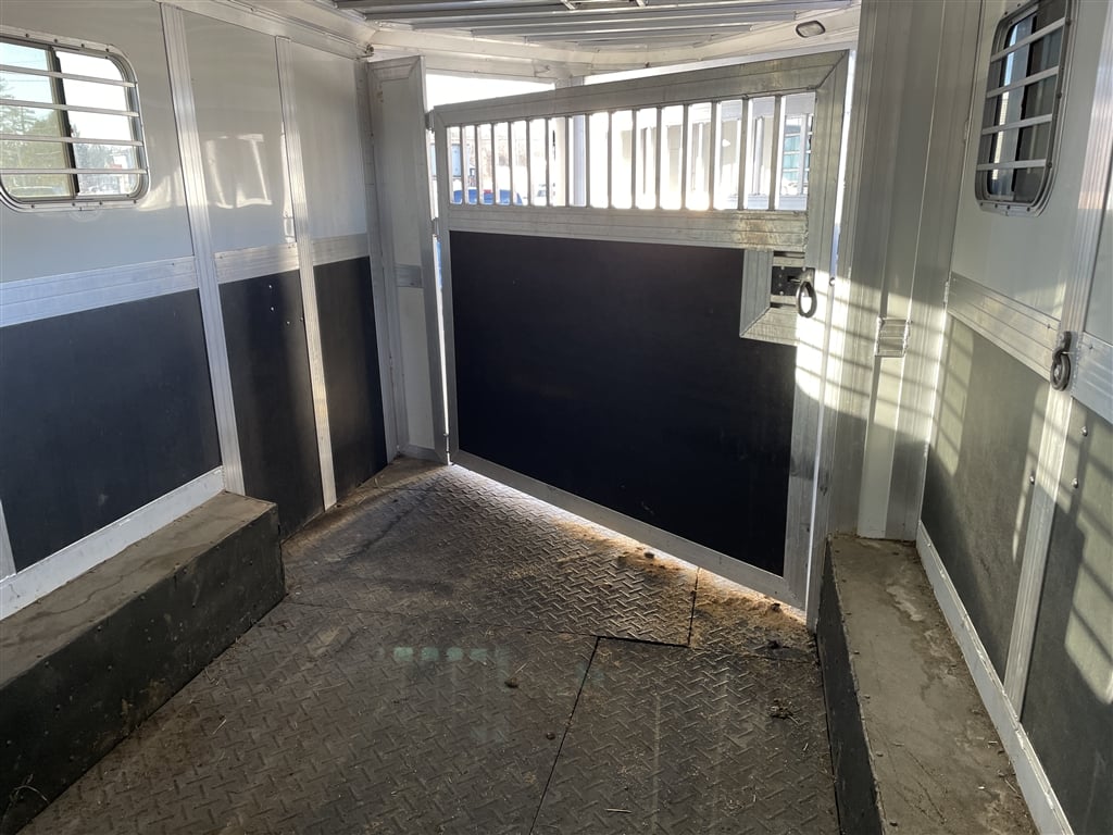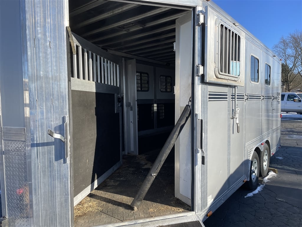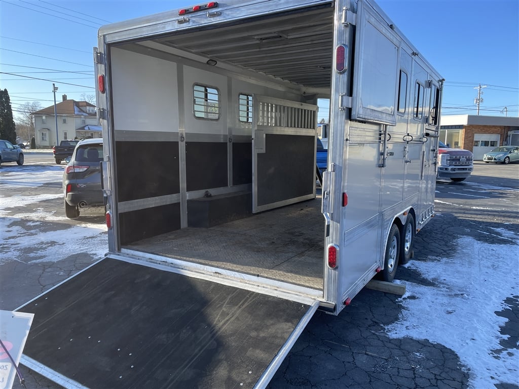 High quality, Custom Designed Horse Trailer. Front Tack area, with it's own Door. Moveable slant panels in front, with ramps on right and left sides, to load and walk your horse right through. Above the front and side ramps are tinted and barred windows that can slide open, or the whole top window panel can be opened up for more air flow. The large rear area has a full-width ramp with left and right top panels that can also be fully opened for more ventilation. All the ramps and floor of the trailer are equipped with non-skid rubber material. Every ramp and top opening panel can either be solidly latched in an open position for travel, or a closed position with provisions to lock everything down for security. Very solidly built with many moving panels for flexibility. Very gently used to occasionally move one horse and a carriage. Easy towing V-Nose design, Custom Chrome 15'' wheels, tires in good shape, 9950 GVW, bumper pull set up for 2 5/16'' ball. Originally designed as a horse trailer, but this would also easily serve as a toy hauler or contractors trailer. For play, You could use the back for quads or side by sides, and make the front into a camper. The builder could install work benches and tool storage down the sides, and have the center wide open to work or haul and securely store materialsat the jobsite. The perfect workshop on wheels. Lots of uses for lots of people. Please stop by an explore the possibilities for yourself. Thanks for looking.